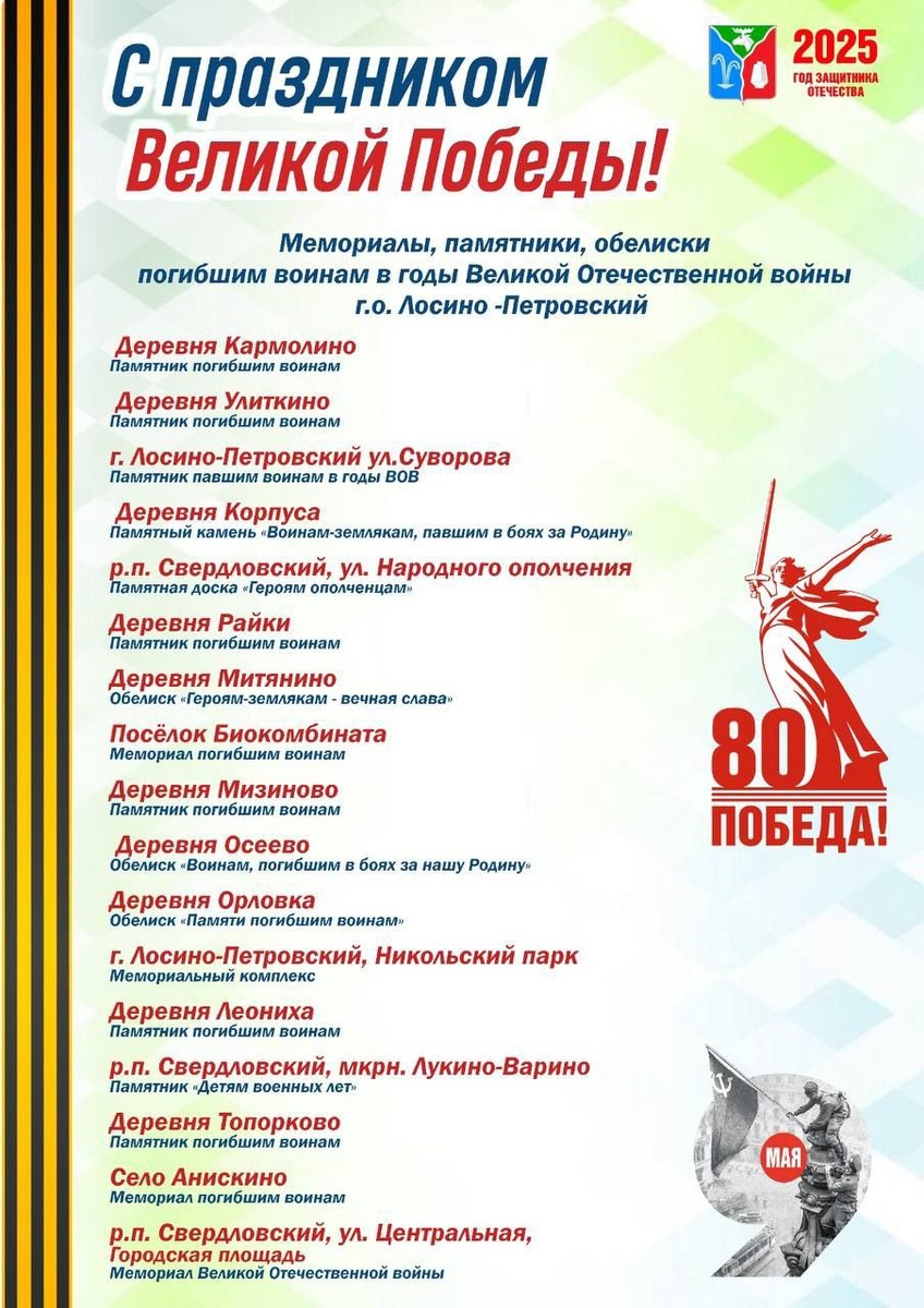 ΠΏΡΠ°Π·Π΄Π½ΠΎΠ²Π°Π½ΠΈΡ 80-Π»Π΅ΡΠΈΡ ΠΠΎΠ±Π΅Π΄Ρ Π² ΠΠ΅Π»ΠΈΠΊΠΎΠΉ ΠΡΠ΅ΡΠ΅ΡΡΠ²Π΅Π½Π½ΠΎΠΉ Π²ΠΎΠΉΠ½Π΅, ΠΆΠΈΡΠ΅Π»ΠΈ ΡΠ°ΠΌΠΎΡΡΠΎΡΡΠ΅Π»ΡΠ½ΠΎ ΠΌΠΎΠ³ΡΡ Π²ΠΎΠ·Π»Π°Π³Π°ΡΡ ΡΠ²Π΅ΡΡ ΠΊ ΠΏΠ°ΠΌΡΡΠ½ΠΈΠΊΠ°ΠΌ, ΠΎΠ±Π΅Π»ΠΈΡΠΊΠ°ΠΌ, ΠΌΠ΅ΠΌΠΎΡΠΈΠ°Π»Π°ΠΌ, ΡΠΊΠ°Π·Π°Π½Π½ΡΠΌ Π² Π°ΡΠΈΡΠ΅. ΠΡΠΈ ΡΡΠΎΠΌ ΡΠ±Π΅Π΄ΠΈΡΠ΅Π»ΡΠ½ΠΎ ΠΏΡΠΎΡΠΈΠΌ ΠΈΠ·Π±Π΅Π³Π°ΡΡ ΠΌΠ°ΡΡΠΎΠ²ΠΎΠ³ΠΎ ΡΠΊΠΎΠΏΠ»Π΅Π½ΠΈΡ Π»ΡΠ΄Π΅ΠΉ Ρ ΠΌΠ΅ΠΌΠΎΡΠΈΠ°Π»ΠΎΠ² ΠΈ ΡΠΎΠ±Π»ΡΠ΄Π°ΡΡ ΠΎΡΡΠΎΡΠΎΠΆΠ½ΠΎΡΡΡ.Β Π‘ΠΏΠ°ΡΠΈΠ±ΠΎ Π·Π° ΠΏΠΎΠ½ΠΈΠΌΠ°Π½ΠΈΠ΅! ΠΠ΅ΡΠ΅Π³ΠΈΡΠ΅ ΡΠ΅Π±Ρ ΠΈ ΡΠ²ΠΎΠΈΡ