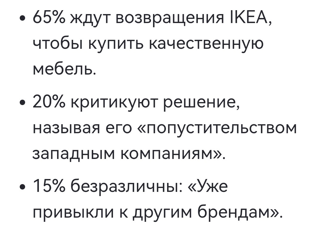 И всё-таки их большинство – тех, кто считает мебель из ИКЕА качественной, и кому не терпится снова иметь возможность покупать комоды «Радость Самоделкина» и дешёвые диваны по цене дорогих (а цены обещают поднять как минимум на 30% от того, что было до ухода, а было уже не дёшево, вот и считайте). Ну как бы хммм…