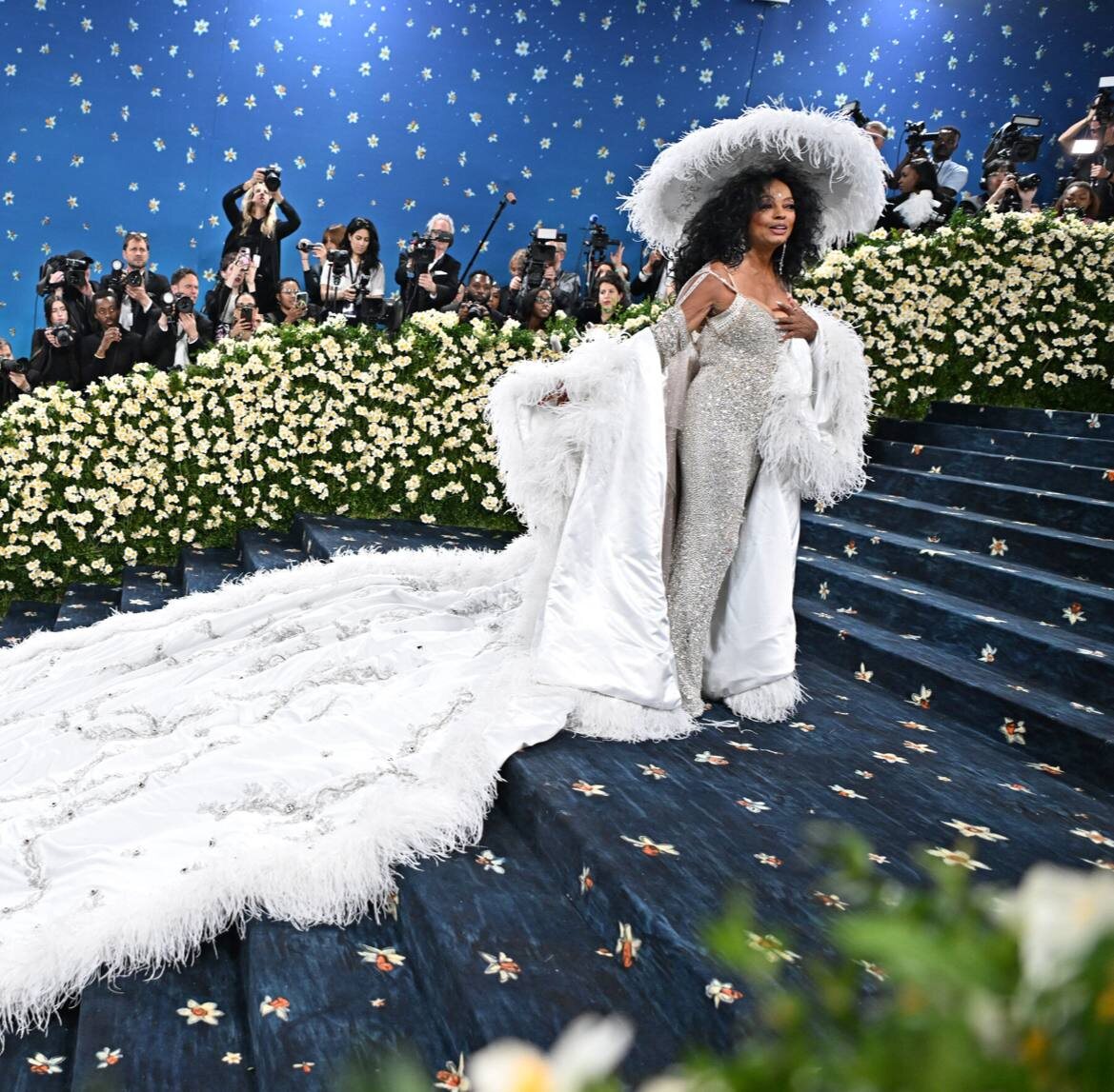 Даяна Росс и ее 6 метровый шлейф с вышитыми именами ее детей и внуков. Чтобы поднять Даяну и ее шлейф, понадобилось 6 человек-помошников. Легенда!