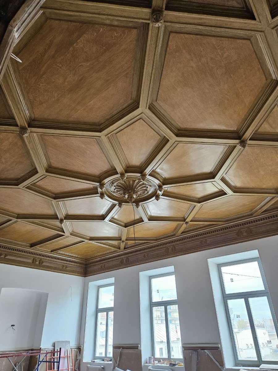 На фото отделка потолока в особняке Н. М. Полежаева (я занималась реставрацией на этом объекте) пр. Бакунина, 8 (1877–1878) В конце XIX века (1880–1900-е годы) стоимость отделки потолка деревом в России зависела от материала, сложности работы и статуса мастеров. Вот детализированная информация: 1. Стоимость материалов (за 1 кв. сажень ≈ 4,55 м²) - Дешёвые породы (сосна, ель) – 3–8 рублей (простая обшивка). - Благородные породы (дуб, орех, красное дерево) – 10–25 рублей. - Эксклюзивные варианты (морёный дуб, карельская берёза) – 30–60 рублей. - Позолота, резные розетки +50–100% к стоимости. 2. Оплата труда мастеров (в день) - Плотник – 1–1,5 рубля (простая обшивка). - Столяр – 2–3 рубля (фигурные панели, молдинги). - Резчик по дереву 3–5 рублей (за сложные орнаменты). - Художник-декоратор (роспись) 5–10 рублей. 3. Примерная итоговая стоимость - Эконом-вариант (сосна + покраска) – 5–12 рублей за сажень. - Дорогая отделка (дуб, резьба) – 25–60 рублей за сажень. - Роскошный потолок (кессон