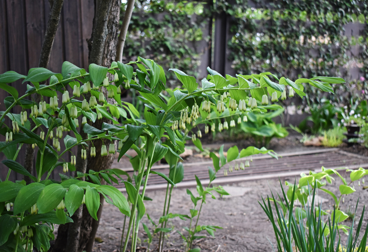 Мой неожиданный японский уголок тоже не обошелся без купены. Но до заметной куртинки ей еще долго расти. Хотя мне уже нравится, как она сочетается с баданом, горянкой и тростниковым заборам аля под бамбук. Так что место как раз для нее. Думаю найти там местечко и для многоцветковой купены. Буду выращивать ее с дицентрами и страусником.