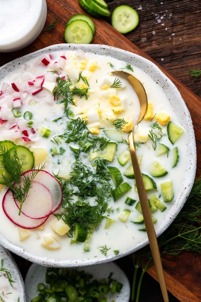 Ингредиенты (на 4 порции): - Основа: - 500 мл свежего хлебного кваса (без сахара) или кефира 1% (для более легкого варианта). - 100 мл натурального греческого йогурта (для густоты и белка). - Овощи и зелень: - 2 огурца (свежих или соленых без избытка соли) — нарезать кубиками. - 5-6 редисок — тонко нарезать. - 1 пучок зеленого лука — мелко порубить. - 1 пучок укропа и петрушки — измельчить. - 100 г шпината или рукколы (по желанию) — добавить свежими. - Белок: - 200 г отварной куриной грудки или индейки (либо тофу для веганской версии) — нарезать кубиками. - 2 яйца: 1 целое яйцо + 2 белка (сокращаем желтки) — отварить и порубить. - Дополнительно: - 2 небольшие отварные картофелины (или заменить на 150 г отварной цветной капусты) — кубиками. - Сок половины лимона или лайма (для кислоты вместо уксуса). - Соль морская по минимуму, перец, горчица (1 ч. л.) — по вкусу. --- Приготовление: 1. Подготовьте ингредиенты: - Отварите картофель (или цветную капусту), яйца и куриную