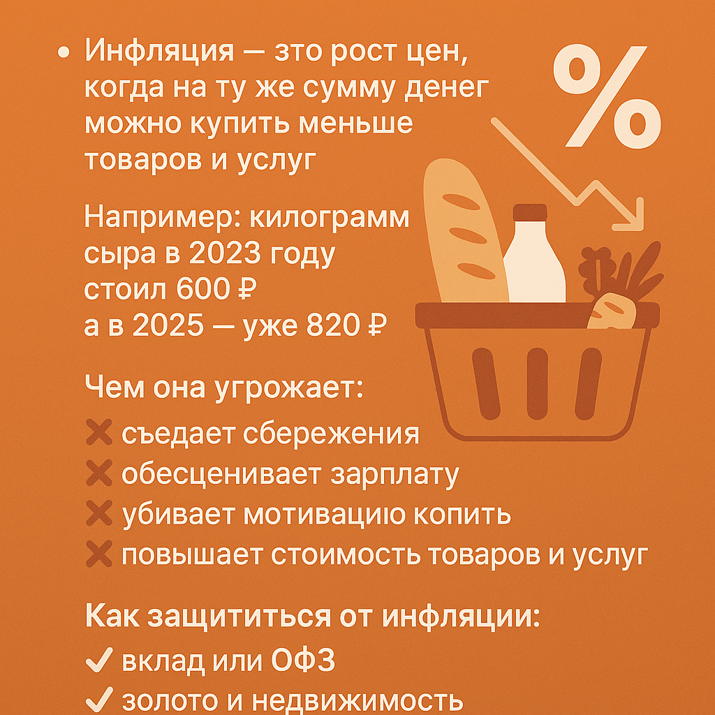 В 2023 году килограмм сыра стоил 600 ₽. В 2025 — уже 820 ₽. Это и есть инфляция: твои 600 рублей подешевели, хотя остались той же суммой. Инфляция — это не только про Россию. Она есть в любой стране, даже в США и Германии. Вопрос — какая скорость роста цен: 2% в год или 20%. ❌ Съедает сбережения