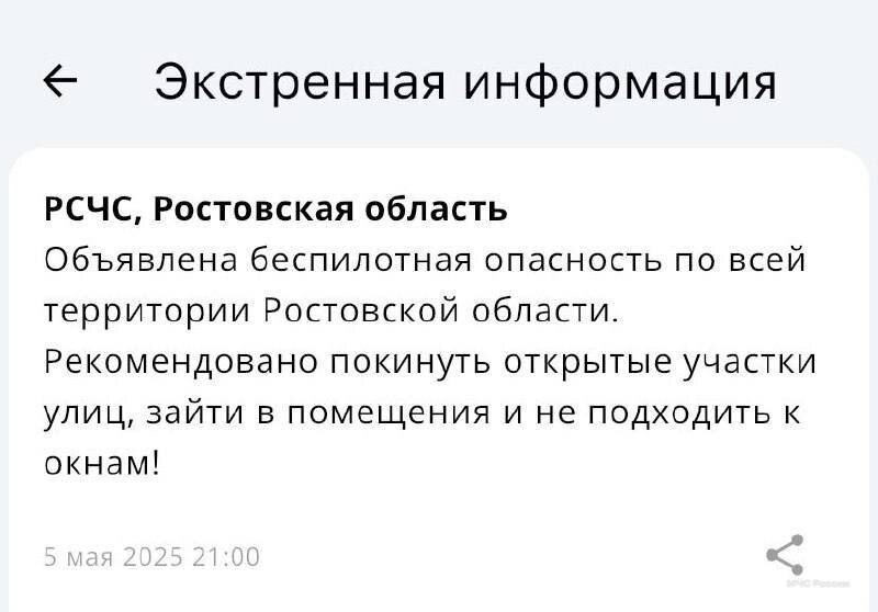 🚨 Беспилотная опасность объявлена в Ростовской области Об этом сообщает РСЧС через приложение МЧС и сотовых операторов. Жителям рекомендовано избегать открытых мест, не подходить к окнам и оставаться в помещениях. Мониторинговые каналы сообщили о группе дронов в районе Чертково, предположительно направляющихся к Миллерово, Новошахтинску, Гуково и Матвееву Кургану. Сведений о последствиях пока нет. 🤬 — Когда это уже закончится?! 👉🏻Новости №1 в Ростове 💌Прислать новость/фото