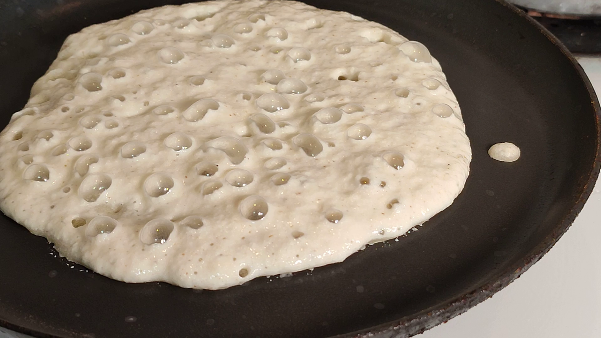 - Разогреть сковороду без масла. Вылить тесто тонким слоем. Жарить только с одной стороны, до образования множества дырочек и полной готовности.