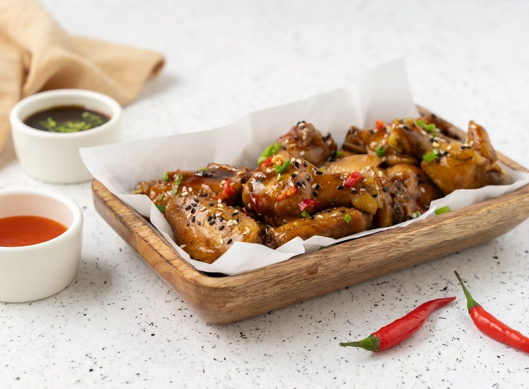 На первый взгляд кажется, что карамель подходит только для десертов. На самом деле это не так. Попробуйте пожарить в карамели куриные крылышки. Получится необычно, но очень вкусно. Добавьте в сахарный сироп немного соевого соуса и лимонного сока для более пикантного вкуса. Куриные крылышки 10 шт. = 1000 г Вода 5 стакан = 1000 г Молотая куркума 1 ч. л. = 3 г Молотый кориандр 0.5 ч. л. = 1 г Сахар 1 ст. л. = 25 г Растительное масло 2 ст. л. = 34 г Соевый соус 2 ст. л. = 30 г Лимонный сок 4 ст. л. = 72 г Красный жгучий перец 2 шт. = 180 г Чеснок 1 зубчик = 5 г Соль по вкусу Смесь кунжута по вкус Снимите шелуху с чеснока. Разрежьте крылья по суставам. Самые маленькие фаланги выбросьте. Выложите крылышки в кастрюлю с кипящей водой. Добавьте соль, куркуму и кориандр. Варите мясо 15 минут, после чего откиньте на дуршлаг и дайте воде полностью стечь. Налейте соевый соус в небольшую миску. Вылейте туда же сок лимона. Нарежьте и положите в миску жгучий перец. Перемешайте смесь. Налейте в сков