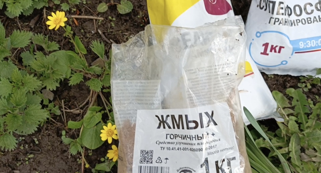 4 мая — отличный день для посадки малины! Солнечный денёк, тепло +16°, за день до этого 2 дня шли дожди, почва увлажнена. Я подготовила 3 саженца малины сорта «Карамелька» с мощной корневой системой. А теперь важно правильно подготовить почву и удобрения. Расскажу, как я это делаю в условиях сырой погоды после дождей. 1. Лунка - Яма уже выкопана, но из-за дождей почва очень влажная, поэтому полив минимальный. 2. Удобрения - Суперфосфат (для наращивания новых корней и адаптации саженца): разводила в 1 литре горячей воды 10 г, затем довела объем до 10 литров. - Аммиачная селитра (20 г) — для наращивания зеленой массы. Добавляю в сухом виде, не разводя. - Горчичный жмых — это и есть секретная подкормка. На самом деле горчичный жмых это органическое удобрение, обладающее фитосанитарными функциями и выполняющее роль биотоплива. Десять килограммов этого продукта заменяют кубометр навоза. Удобрение способно излечивать многие заболевания растений, отпугивает проволочника и слиз