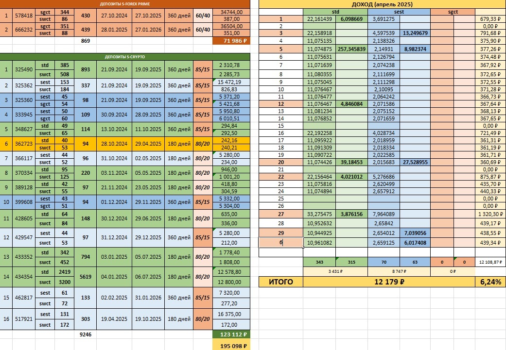 Это мой 7-й полный месяц в S-group. За этот месяц получено 12179 руб в направлении S-Crypto. Доходность составила 6,24% (к сумме всех депозитов 195098 руб на 01.04.2025). В личный кабинет вышел доход (частично за прошлый месяц): 315 std = 3150 руб 63 sest = 7812 руб Итого: 10962,00 руб Доход реинвестировала и создала новый депозит sest/swct = 131/172 на срок 180 дней с распределением дохода 80/20. Депозит № 362723 закрылся по сроку (29.04.2025) и вышел в кошелек. Вот такой получился апрель! Мне все очень нравится! Я небольшими шагами продолжаю двигаться к своим финансовым целям!