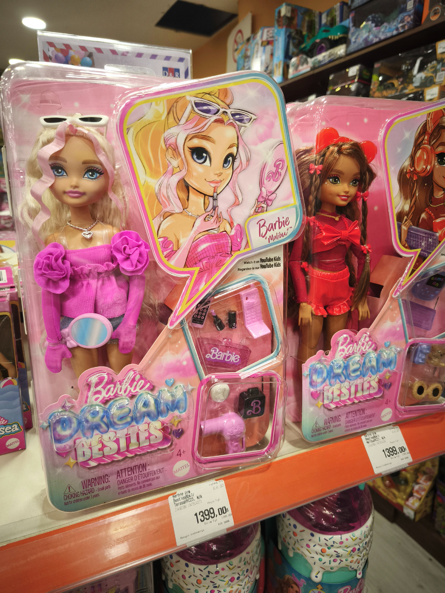 Продолжаю серию публикаций из недавней поездки обзором того, что и почём можно встретить в магазинах в Турции) Из отеля на обычном местном рейсовом автобусе добралась до Антальи, одна из остановок находится возле довольно большого торгового центра, там я и погуляла. Сразу могу отметить, что в прошлом году было интереснее. На этот раз ассортимент уже не так сильно порадовал. Но все равно поглазеть было любопытно) Первые куколки, которые мне встретились - вот эти девочки серии Dream besties. Это я забрела в какой-то книжный магазин, в котором было много игрушек. Все фото старалась делать с ценниками, курс турецкой лиры к рублю сейчас - 2,13. Хорошенькие)) Есть Челсики. Встретились новинки - барби серии делюкс. Максимально розовые, но стильные девчоночки. Были вот такие бюджетные девчонки. Моана прикольная. Джойс хорошенькая Затем я пошла в уже знакомый Toyzz - сетевой магазин игрушек. Там оказалось поинтереснее. Много-много разных игровых Милли. Такую парочку раньше не видела.