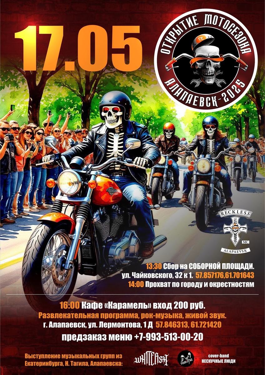 ⚠️⚠️⚠️Дорогие друзья! Мотобратья и мотосёстры, а также все, кому не безразлично мотодвижение! 👉17 МАЯ, АЛАПАЕВСК. 💪Традиционно мотоклуб RECKLESS MC ALAPAEVSK приглашает вас на открытие мотосезона!!! 👉13:30 Сбор на СОБОРНОЙ ПЛОЩАДИ. ул. Чайковского 32к1 57.857176,61.701643 👉14:00 Прохват по городу и окрестностям! ____________________________________ 👉16:00 Кафе «КАРАМЕЛЬ» ул. Лермонтова, 1Д 57.846313, 61.721420 👉ВХОД 200₽ 🍖Предзаказ меню по тел.: +7 993 513-00-20 🔥Развлекательная программа, рок-музыка, живой звук. 🎙Играют и поют для вас: 🎸 Рок-группа "TOURISTAZ" (Н.Тагил) 🎸 Трибьют-проект Nightwish группа “WHITEFISH” (Екатеринбург) 🎸 Cover-band НЕСКУЧНЫЕ ЛЮДИ (Алапаевск) Motorcycle •[ЕКБ] МОТО• #мотосезон2025 #екатеринбург #ekbmoto #moto Источник