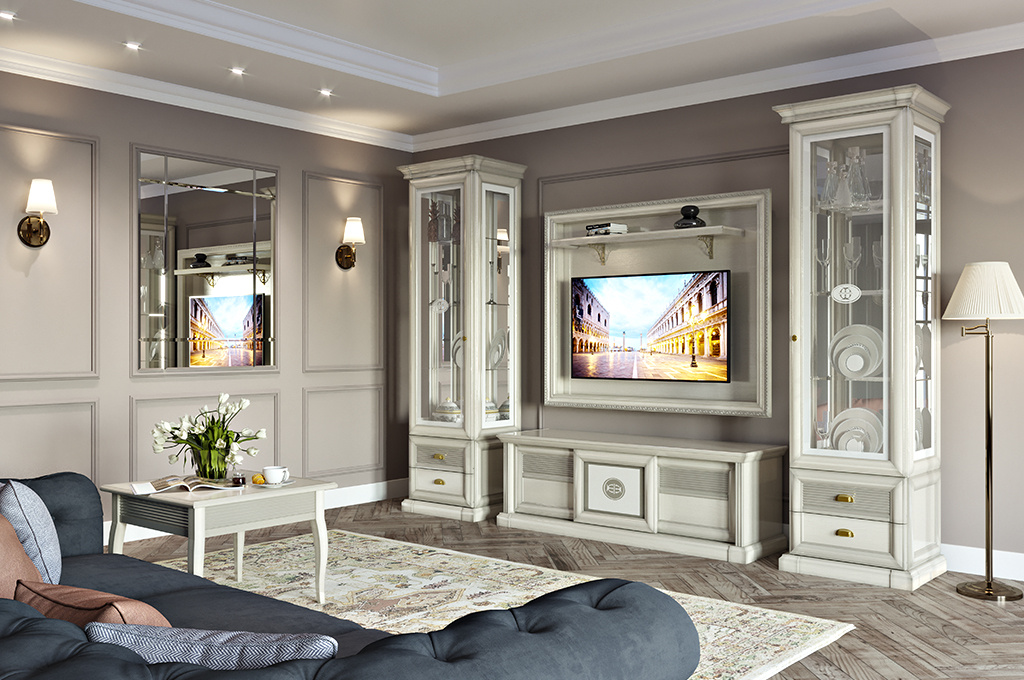- Стенки — набор шкафов и тумб. Часто включают ТВ-зону. Бывают угловыми и линейными.