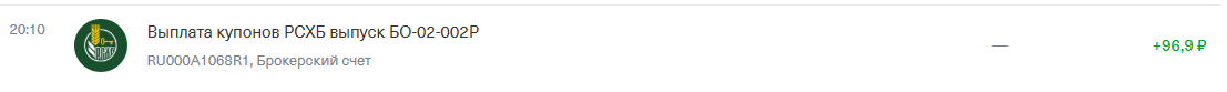 Средства пришли по облигациям "РСХБ выпуск БО-02-002Р" в размере 96,9 рублей за 5 штук.