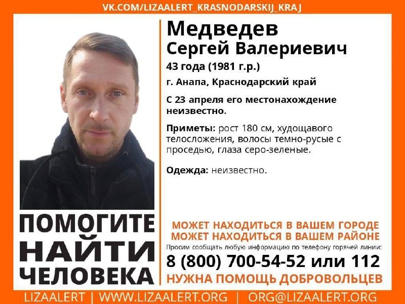 В Анапе пропал Сергей. Его ищут уже почти 2 недели Пропал Медведев Сергей Валериевич,43 года (1981 г.р.) г. Анапа, Краснодарский край С 23 апреля 2025 года его местонахождение неизвестно. Приметы: рост 180 см, худощавого телосложения, волосы темно-русые с проседью, глаза серо-зеленые. Одет: неизвестно. Инфорги поиска: Леся ( Олеся) 89183026765 Горячая линия отряда: 8 800 700 5452 (звонок бесплатный)