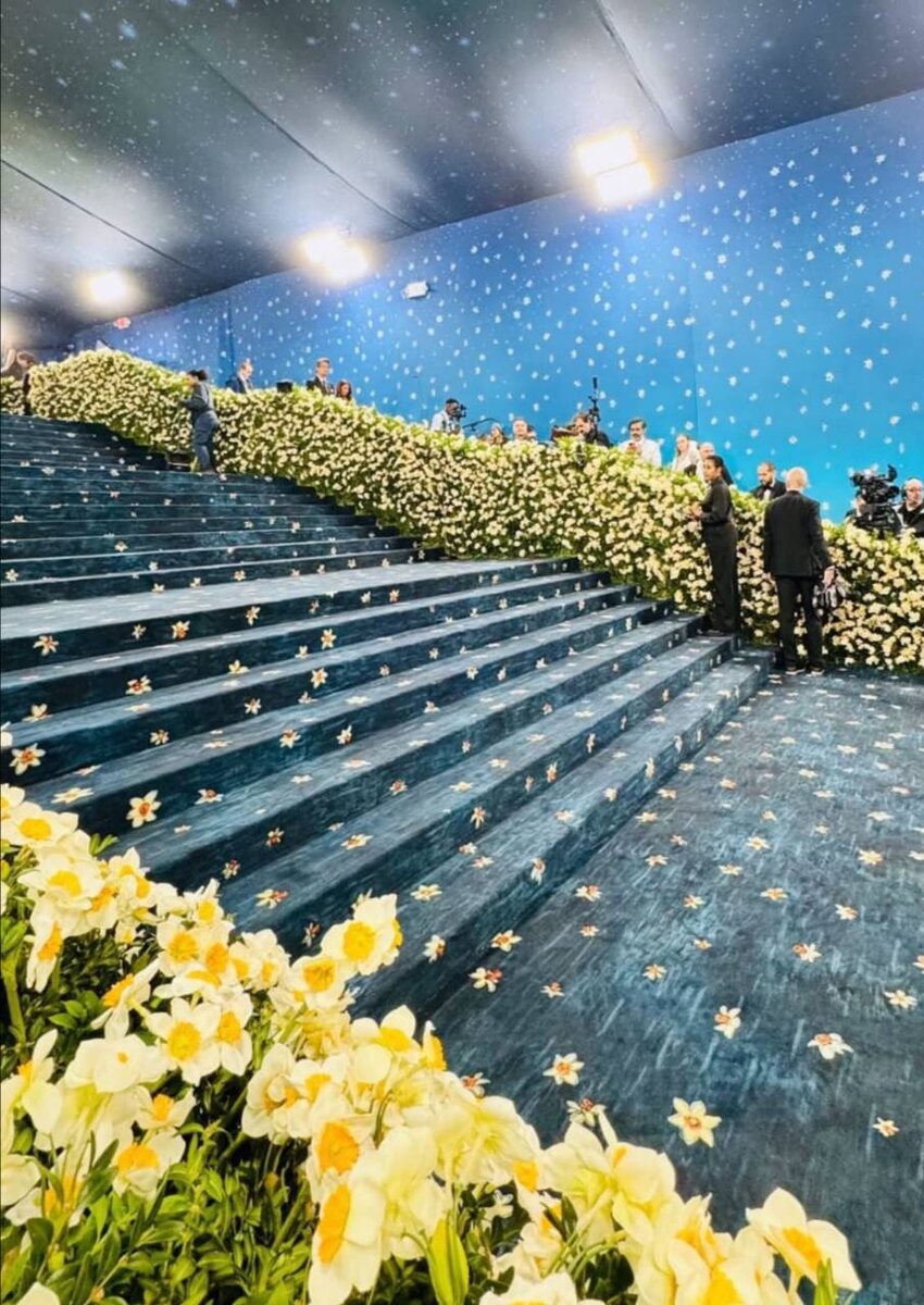 Начинаем ежегодную трансляцию Met Gala. В этом году гости будут позировать на фоне темно-синего ковролина в цветок.