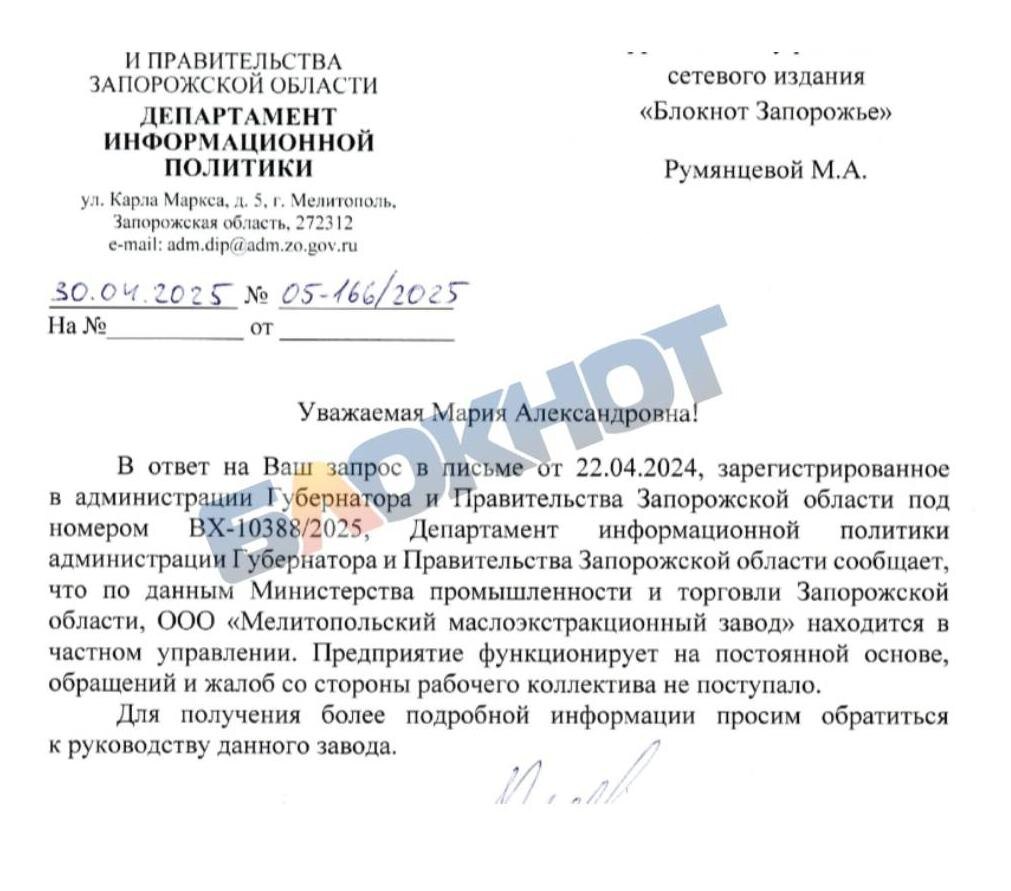 В нашу редакцию через чат-бот «Блокнот Запорожье» поступил сигнал SOS от работников Мелитопольского маслоэкстракционного завода. По их словам, большое количество сотрудников попросту уволили. Причина, правда, не называется. А зарплаты, уверяют сотрудники завода, так и остались весьма скромными. Сегодня они получают в районе 25 тысяч рублей. При этом, описывают ситуацию мелитопольцы, обязанности никуда не делись даже после увольнения многих сотрудников. При той же зарплате задач стало больше в два раза, по словам рабочих. Мелитопольский маслоэкстракционный завод производит подсолнечное масло. По информации из открытых источников, ежегодно предприятие производит 30-35 тысяч тонн масла. Производство - безотходное, завод перерабатывает 95% сырья. А продукцию якобы поставляют даже за рубеж. И всё это выполняют сотрудники с небольшой зарплатой и головокружительным количеством задач, признаются они. Казалось бы, дела завода идут в гору. Откуда тогда такое количество жалоб на руководство? Наша