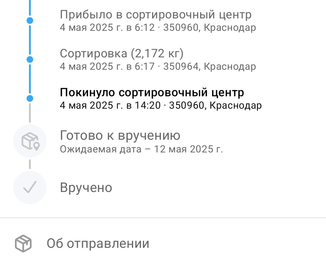 Продаж нет, но пришёл учебник у покупателю, которая 5 дней назад была в сети. Пока не забрали. Не знаю, всякое бывает. Надеюсь, заберут. Но его и так купят, даже если вернётся. А вот ткани, которые я хотела купить., ушли к продавцу назад. Я приболела, забрать реально не смогла. Пришла в субботу- отделение закрыто. У меня продление было до 29 апреля. И тут оказалось, что край дал выходной и почте. А в Москве это не учтено. Обычно последний день для того, чтоб забрать заказ, ставится ближайший рабочий. А тут получилось: субботу- почему-то не работали. Воскресенье, понедельник- официальные выходные. И добавили вторник от края, т. к. Радоница. Итог : 30 числа программа выдать заказ не дала- не могли даже пропечатать. Раньше можно было. Теперь нет. Позвонила отправителю: она мне сказала: да, всё, хорошо, вернётся отправлю. Сегодня выносит мне мозг: да мне сказали на почте, что посылку в утиль в Краснодаре отправили. Вы меня подвели, вы обещали. Пишу: я же Вам позвонила, предупредила. Об