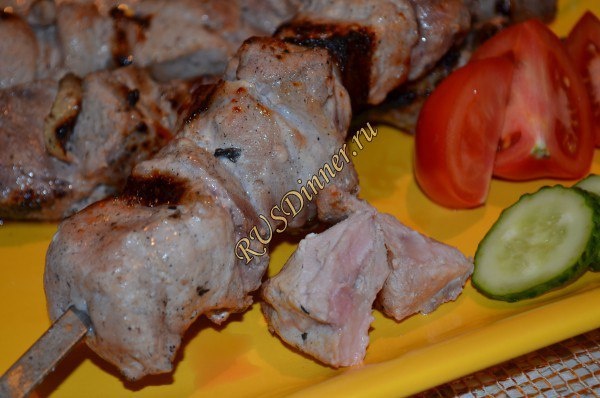 Шашлык, маринованный в кефире Ингредиенты: Свинина - 1000 гр. Кефир - 500 мл. Лук репчатый - 3 шт. Чеснок - 6 зуб. Лимон - 1 шт. (0,5 шт) Соль - 20 гр. Перец черный молотый - 20 гр. Источник: https://rusdinner.ru/page/shashlyk-marinovannyj-v-kefire