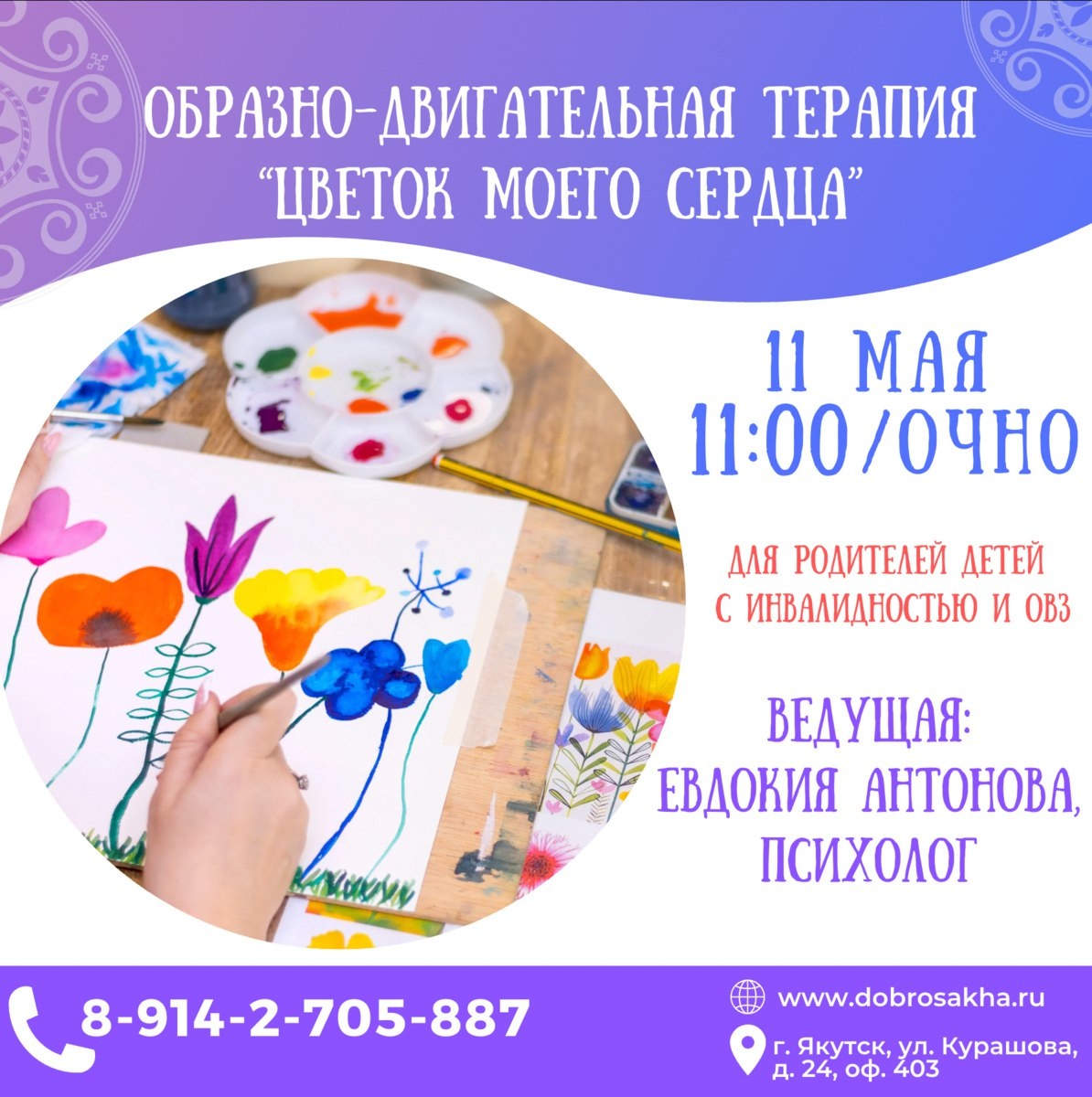🌸 Приглашаем родителей на образно-двигательную терапию «Цветок моего сердца»! 🌼 Тело — это вместилище нашего внутреннего мира, а движения — это окошко в этот удивительный мир. 🌈 🧘♀️ Ведущая: психолог Евдокия Антонова 📅 Дата: 11 мая (воскресенье) с 11:00 ч. 🏢 Место: офис благотворительного фонда «Харысхал», г. Якутск, ул. Курашова 24, каб. 403 👥 Доступно всего 6 мест! Не забудьте принести с собой коврики и удобную одежду! 🤗 Запись по ссылке: https://bf-kharyskhal.timepad.ru/event/3359315/ 🔗 Телефон «Службы Заботы»: 8914-2-705-887 #ЗаписьХарысхал #фондХарысхал *Проект реализуется за счет средств, предоставляемых Министерством труда и социального развития РС(Я) #МинтрудЯкутии