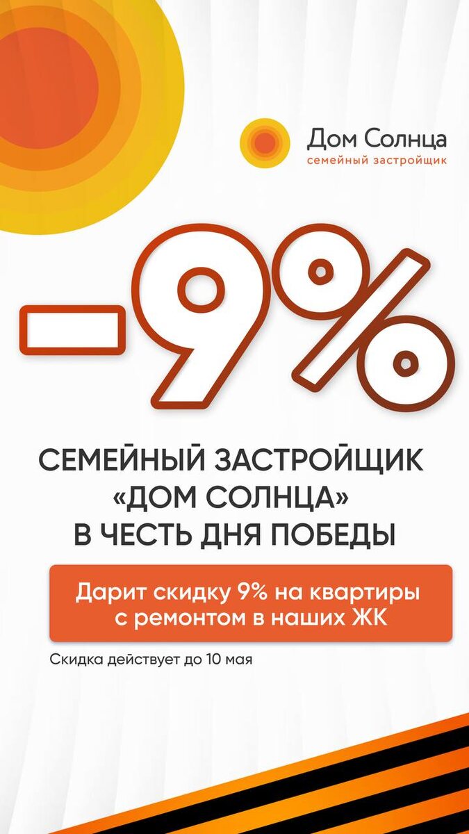 Дорогие друзья, в честь праздника Великой Победы объявляем скидку 9% на любую квартиру с ремонтом! Скидка действует при покупке или бронировании квартиры с ремонтом от застройщика кроме двухуровневых хайфлетов.