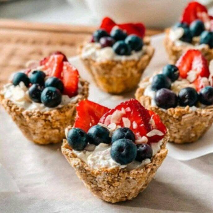 Овсяные корзинки Ингредиенты: 👉🏻 Овсяные хлопья - 100г 👉🏻 2 яйца 👉🏻 Цедра и сок лимона 👉🏻 Ваниль 👉🏻 Подсластитель по вкусу 👉🏻 Творог - 200 г 👉🏻 Йогурт белый - 2 ст.л. 👉🏻 Фрукты - до 50г ➖ С овсяными хлопьями выбиваем 2 яйца, натираем немного цедры лимона, и добавляем сок, это даст особого вкуса, сюда же подсластитель и ваниль. Форму для выпекания смазываем кокосовым или сливочным маслом (минимально) ➖ Из овсяной смеси формируем корзиночки (рекомендую смачивать руки в воде, тогда процесс удобный и хорошо лепится форма). ➖Ставим выпекаться на 20 мин при 200 градусов К творогу добавляем йогурт, ванильный сахар и подсластитель. Можно просто размять вилкой или взбить блендером, украшаем ягодами. Приятного аппетита!
