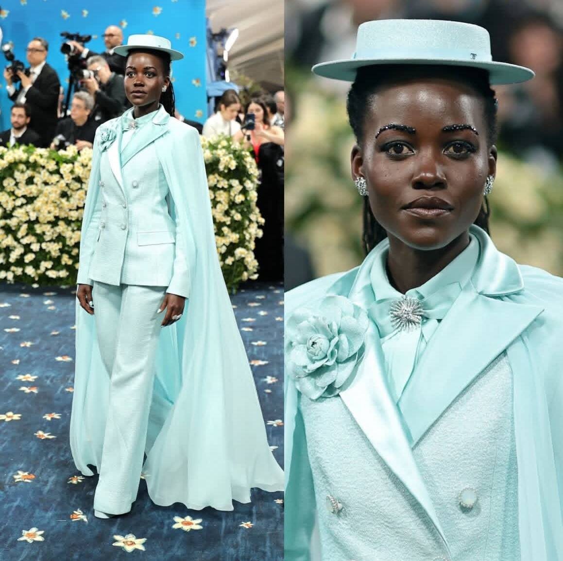 Люпита Нионго сменила образ на созданный специально для нее смокинг с кейпом Chanel. А этот креативный макияж бровей.