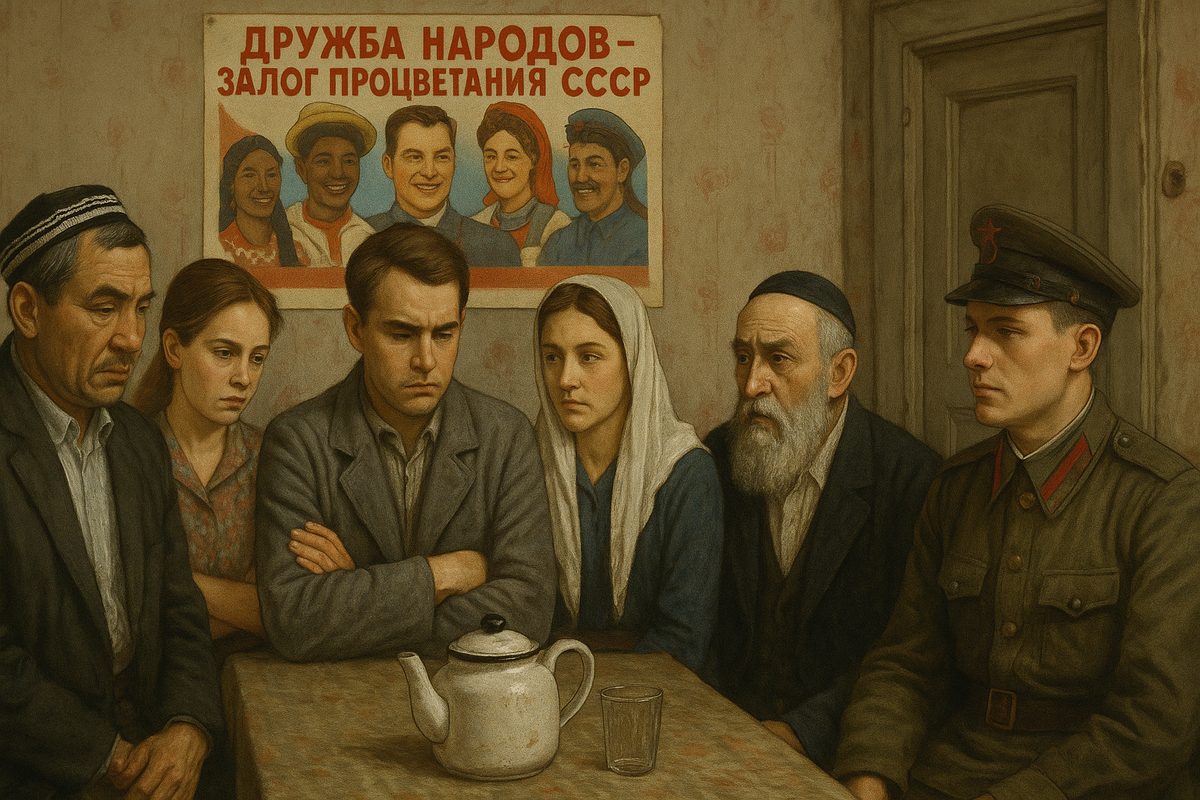или как лозунг стал дымовой завесой для страха, недоверия и депортаций Представь себе коммуналку. Большую, шумную, на десять семей. В одной комнате — армяне, в другой — русские, за стенкой — украинцы, дальше — евреи, татары, узбеки, кто угодно. На кухне — общая плита, общий чайник, и общий страх сказать что-то не то. Вроде бы живут вместе. И даже «дружно» — с виду. Поздравляют друг друга с праздниками, улыбаются. Но только до тех пор, пока не зайдёт разговор о чем-то важном. Потому что под этими улыбками — натянутая тишина. Потому что каждый знает: если что — первым сдадут не своих. Вот такой и была советская «дружба народов». Красивый лозунг — а под ним хрупкая, искусственная конструкция, склеенная пропагандой и контролем. Сталин часто говорил: «У нас нет национального вопроса. Все народы равны». Но стоило одному из этих «равных» не угодить вождю — и вперёд, в эшелоны. Чеченцы, ингуши, крымские татары, калмыки, немцы Поволжья — целыми народами отправлялись в Сибирь. Не за преступлени