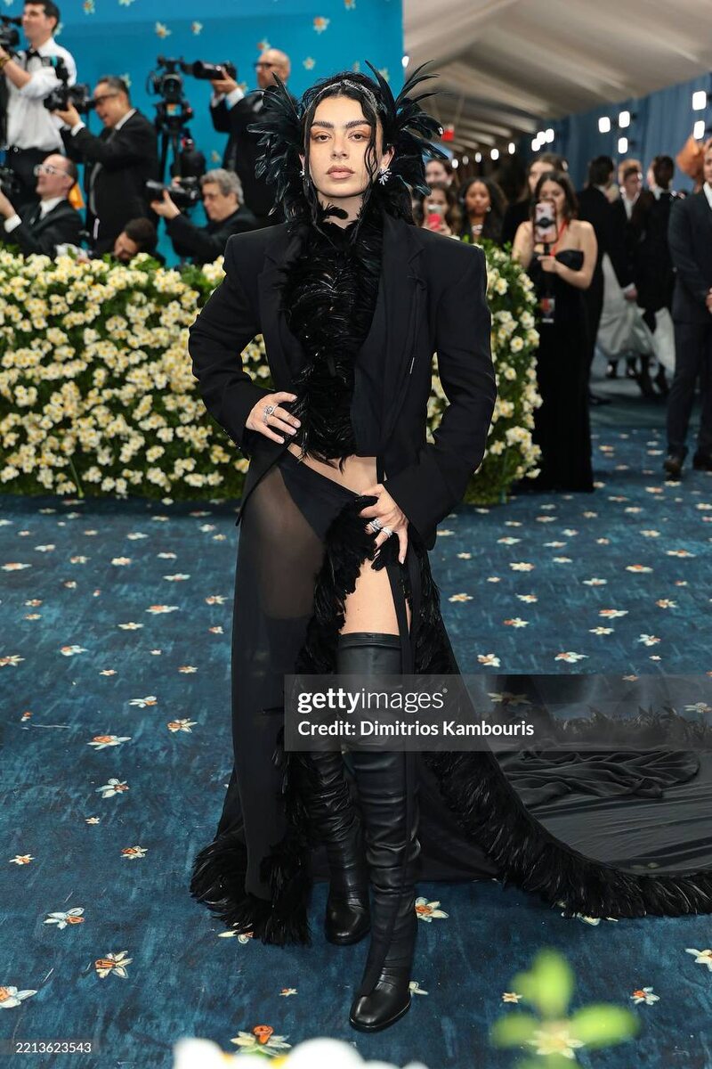 Make перья great again? Charli XCX предпочла привычному черному костюму комплект с готическим настроем.