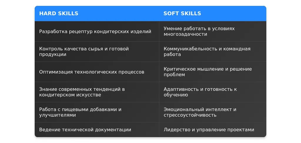 - Навыки: работа с продуктами, знание технологий, общение с людьми.