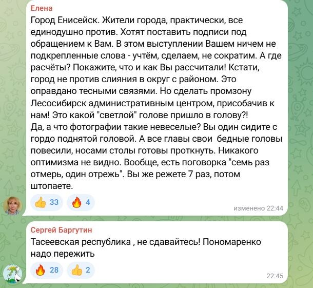 Губернатор края Михаил Котюков не намерен отступать от проведения муниципальной реформы В правительстве Красноярского края прошло совещание с главами муниципалитетов в связи с проводимой реформой, которую инициировал Михаил Котюков. Соответствующий закон был внесён в краевой парламент, и региональные депутаты его тут же приняли в первом чтении. Всё это вызвало волну негодования среди населения. Многие районы навсегда исчезнут с карты Красноярского края, при этом мнение людей об этом никто не спросил. Две недели люди из различных районов записывают видеообращения, подписывают петиции к главе государства с одной только просьбой — остановить начавшуюся реформу и сохранить их территории. Краевые власти до последнего сохраняли молчание, упорно делая вид, что это не столь значимый вопрос, называя протестующий народ мифическим. Несколько акций протестов прошли в очном формате. Порядка 400 жителей Тасеевского района вышли с требованиями и плакатами на центральную площадь села, аналогичная м