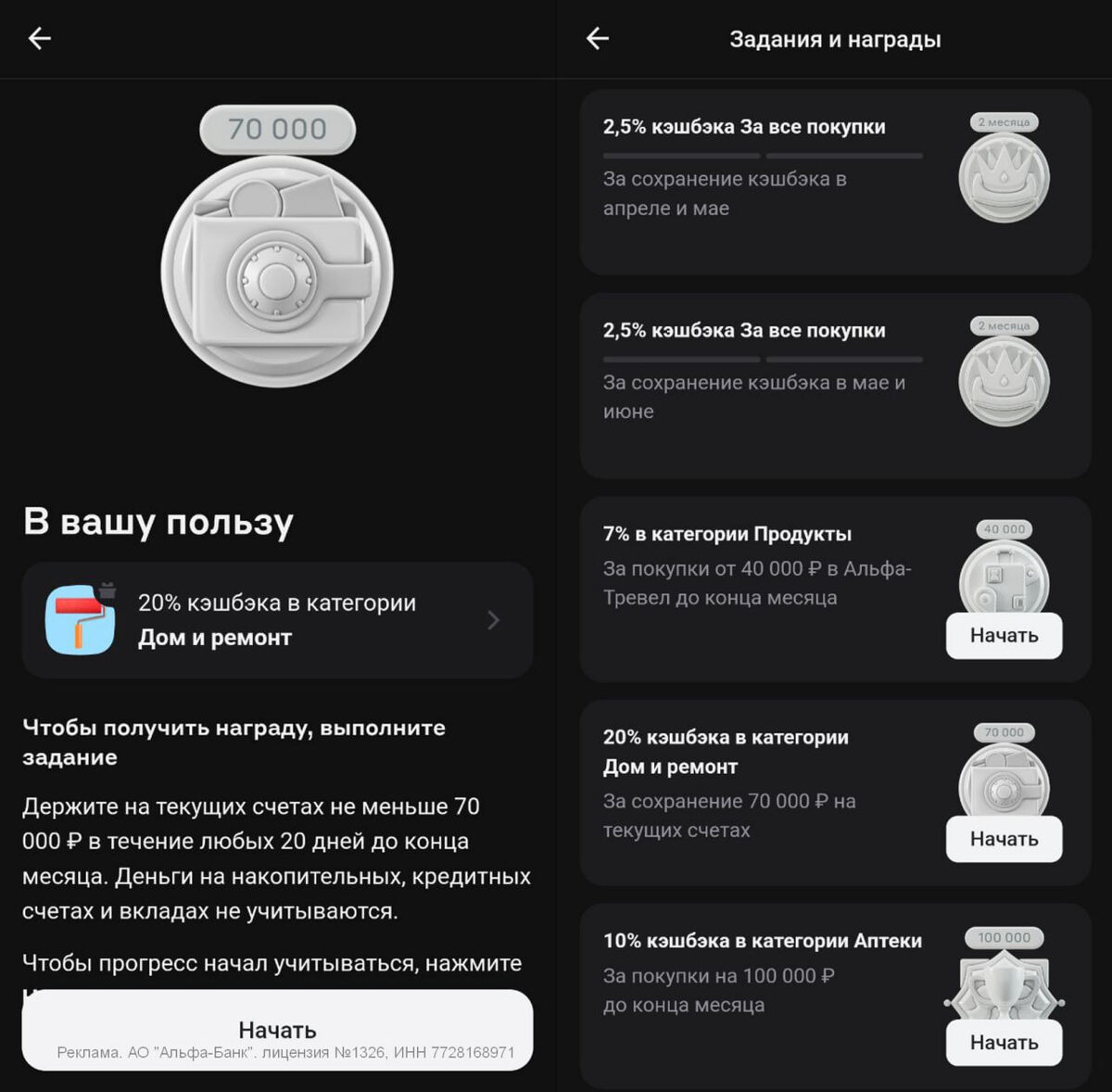 ♦️ Альфа: как получить до 20% на «Дом и ремонт» ⚡ В заданиях Альфы появилась годнота: 20% кэшбэк на категорию «Дом и ремонт» в след. месяце при условии, что 70К пролежат на текущем счёте любые 20 дней до конца мая. Деньги не работают, да. Но давайте посчитаем. Без подписки: ➡️ Максимум кэшбэка — 5 000 рублей. Значит, тратим 25 000. ➡️ Проценты за 20 дней не получаем за 70К (по ставке в среднем 21%) — теряем ≈805 руб. ➡️ Чистая выгода — 4 195 руб. ➡️ Эффективный кэшбэк — 16,8%. С подпиской Альфа Смарт (399/мес): ➡️ Лимит — 7 000 баллов, тратим 35 000. ➡️ Те же 805 руб. потерь + 399 за подписку. ➡️ На выходе — 5 796 руб. выгоды, или 16,6% эффективного кэшбэка. Для премиалов Alfa Only выгода еще больше. Там макс кэшбэк 15К. 💡 Важно: задание нужно сначала активировать в приложении, потом выполнять условия. Найти: вкладка «Выгода» → Задания и награды. Нюансы: 🤩 Считаются любые 20 дней с мин. остатком 70К на текущем/зарплатном счёте (вклады и НС не подходят). 🤩 Если сделали 20 дн