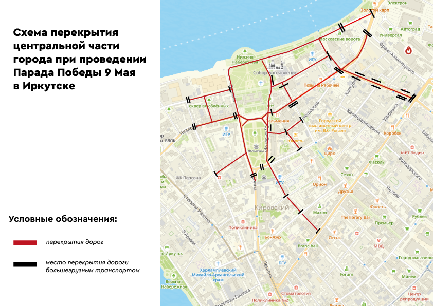 Парковка личного автотранспорта будет запрещена в радиусе 500 метров от мест перекрытия, будет работать эвакуатор. Для удобства иркутян РКТЦ «Фортуна» откроет парковку на территории на весь день. Воспользоваться ей можно будет бесплатно.