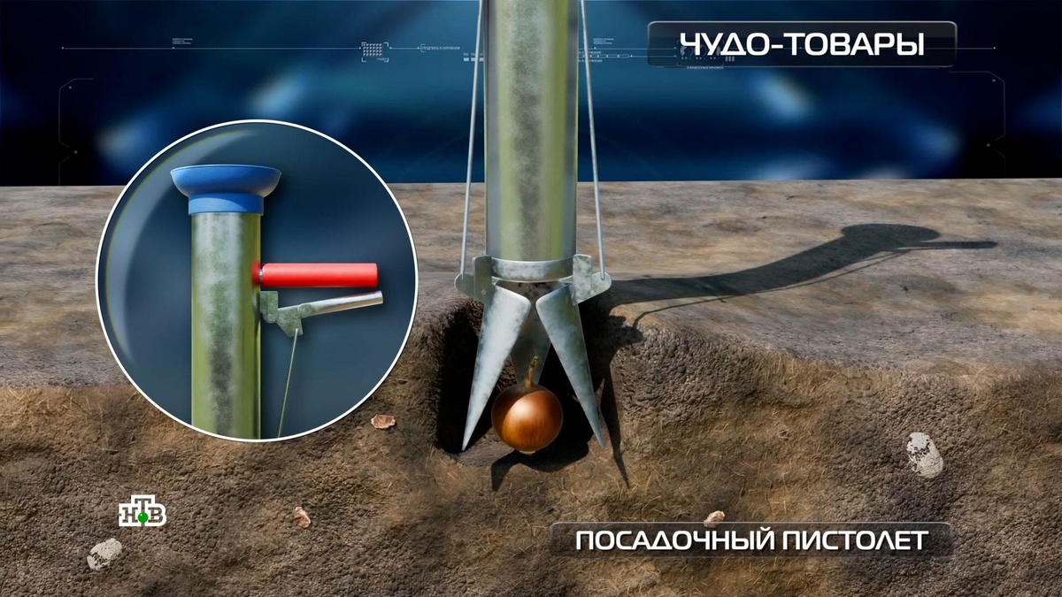 [ Смотреть видео на сайте НТВ ] Радость от собственного урожая и вкусных заготовок нередко идет в комплекте с болью в спине. Для садовых работ все время надо нагибаться. Хотя бы частично облегчить этот труд обещают производители посадочного конуса-пистолета за 1400 рублей. Высота устройства позволяет высаживать растения, не наклоняясь и не садясь на корточки. Вводите его в землю, заряжаете саженец или луковицу и, нажав на спуск, раскрываете в почве лопасти. Больше не нужна даже лопата. За высокую стальную прочность продавцы назвали устройство «Терминатором». Первые впечатления радуют — можно сажать одной рукой и беречь спину. Единственный минус в том, что лопасти плохо раскрываются, но при посадке картошки это не мешает. Похожая технология применяется профессионалами в сельском хозяйстве. Там есть специальные машины с конусами или высаживающими дисками, куда операторы успевают помещать саженцы. Садоводы-любители тоже применяют небольшие посадочные устройства. Их хвалят за экономию сил