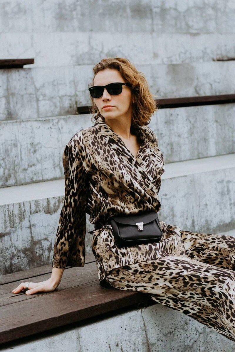 Костюм Penelope выполнен из натуральной ткани, с брюками на резиночке сзади и блузой на запах до середины бедра, которая визуально удлиняет силуэт, и идет всем типам фигур 🥰