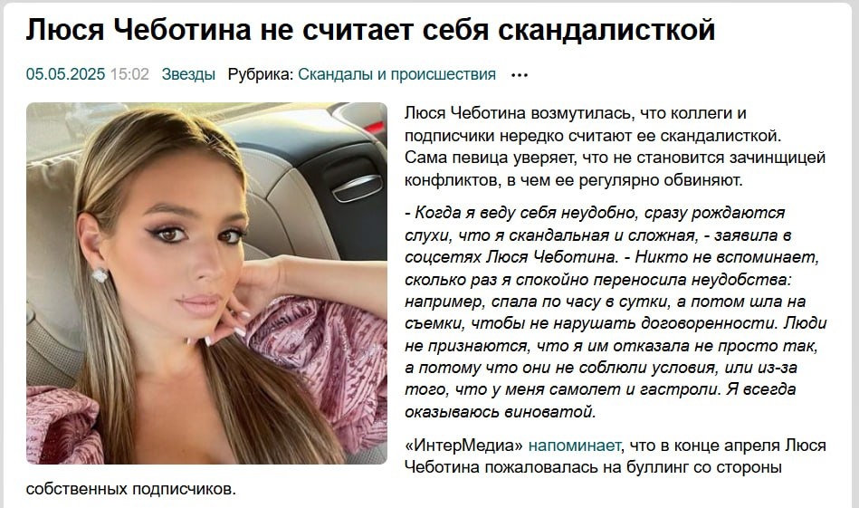 Не очень понятно, чем эта кукушка, которую так любят на Авторадио и Лайкэфэм, недовольна. Пожинает то, что посеяла. Сегодня задумался - почему я раньше стеснялся рассказать о чудовищном случае в Государственном Кремлёвском Дворце на каком-то из сборных концертов пару лет назад, куда мы пришли с артисткой, и нам досталась гримёрка с Люсей Чеботиной. Ну, - думал, - вот и познакомимся. Ага. Познакомились. Кремль - серьёзное место. Оставил артистку в гримёрке, готовиться к выступлению, пошёл в артистическую столовку - за чаем-кофе-бутербродами. Возвращаюсь через несколько минут - у входа в гримёрку стоит пара амбалов: - Вы куда? - спрашивает - У меня там артистка! - отвечаю - Её здесь нет! - грозно сдвинулись амбалы, не пускают. Звоню артистке. Она, оказывается, в гримёрке напротив - с Дианой Гурцкой и Алёной Ланской, "в тесноте, да не в обиде!" Дружелюбно приняли, слова не сказали. Все всё поняли... - Как так получилось? - спрашиваю - Так эта "звезда" меня выгнала! - говорит артистк