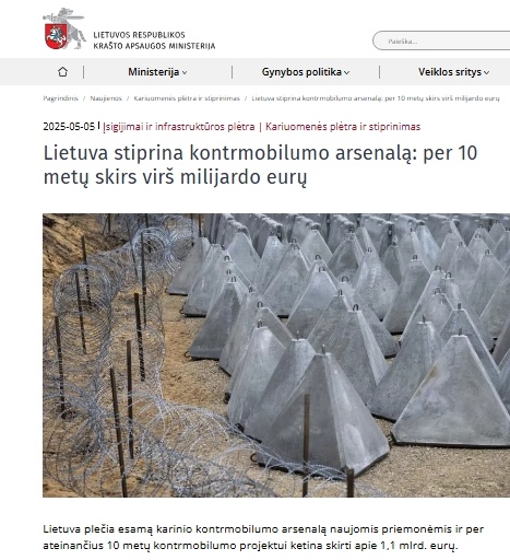 Министерство обороны Литвы объявило на своем официальном сайте о масштабной оборонной инициативе: в течение следующего десятилетия страна направит 1,1 миллиарда евро на усиление восточной границы с Россией и Белоруссией. Ключевая часть этой суммы — около 800 миллионов евро — будет потрачена на приобретение и установку противотанковых мин. Ведомство объясняет такие меры растущей обеспокоенностью в связи с возможной угрозой со стороны России, особенно если та добьется успеха в военной операции на Украине. Литва, имеющая границы с Калининградской областью России и северо-западом Беларуси, не исключает сценария, при котором три прибалтийских лимитрофа — Литва, Латвия и Эстония — могут стать следующей целью России. Согласно заявлению министерства, будущие вложения призваны «заблокировать и замедлить» потенциальную агрессию. «Важно отметить, что при реализации мер по противодействию мобильности большое внимание уделяется взаимодействию с местным самоуправлением. Мы должны обеспечить не тольк