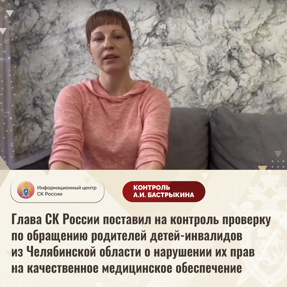 Глава СК России поставил на контроль проверку по обращению родителей детей-инвалидов из Челябинской области о нарушении их прав на качественное медицинское обеспечение В социальной сети размещено видеообращение к Председателю СК России А.И. Бастрыкину от родителей детей-инвалидов из Челябинской области по вопросу нарушения их прав на качественное медицинское обеспечение. С 2019 года несовершеннолетним с редким заболеванием предоставлялся жизненно необходимый лекарственный препарат, при использовании которого у них наблюдалась положительная динамика. Однако с августа прошлого года пациентам стали выписывать рецепты на получение льготного аналога, до настоящего времени не прошедшего клинических испытаний. Заявители опасаются, что замена лекарства может повлечь ухудшение состояния детей и возникновение у них осложнений. Многочисленные обращения в профильную структуру результатов не принесли. В СУ СК России по Челябинской области по данному факту организована процессуальная проверка. Пред