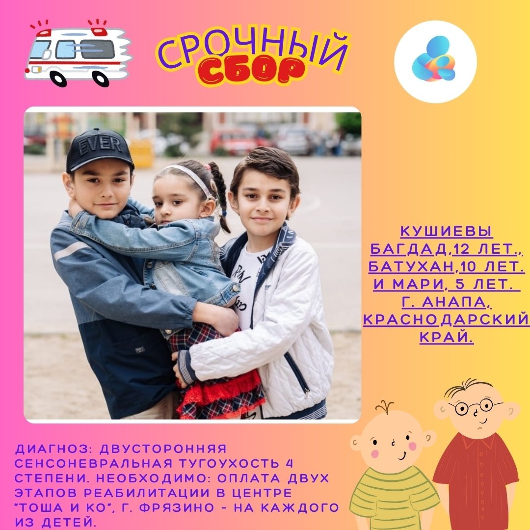 Этот Срочный сбор висит на сайте с зимы. И неудивительно - всем троим детям из этой анапской семьи необходима слухоречевая реабилитация. Более 600 тысяч рублей. Собранной на сегодняшний день суммы хватает только для одного ребенка. Еще двое детей ждут помощи. Просим вас поддержать ребят! https://stranadetyam.ru/campaign/kushievy-bagdad-12-let-batuhan-10-let-i-mari-5-let-g-anapa-krasnodarskij-kraj/