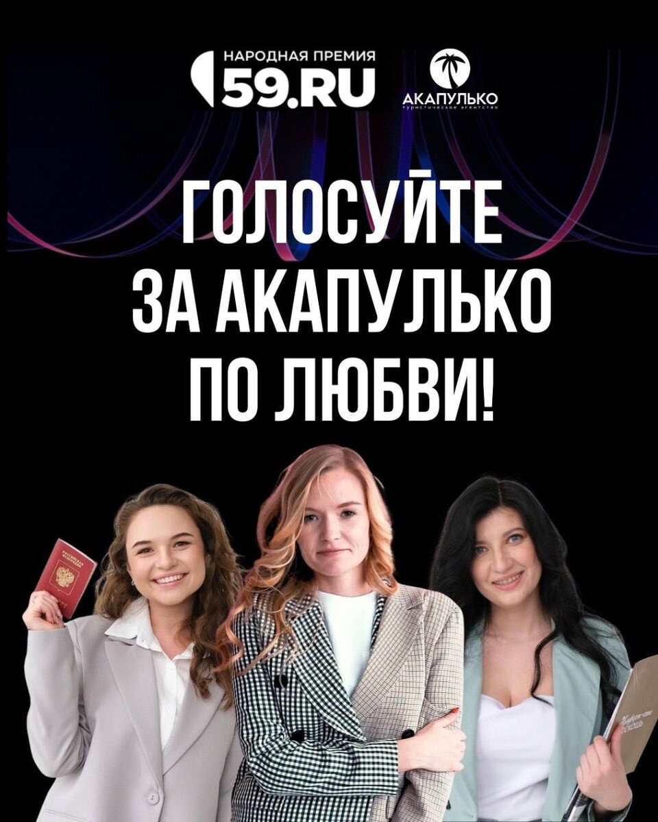 ❤️ НАМ НУЖНА ПОДДЕРЖКА ВАШИХ СЕРДЕЦ. Голосуйте за Акапулько по любви! Друзья, вот уже 15 лет мы воплощаем ваши самые яркие и смелые путешествия по всему миру. Наши туристы открыли для себя больше 50 удивительных стран на Земле. Сейчас мы участвуем в НАРОДНОЙ ПРЕМИИ 59.ru в номинации «Туристическое агентство года» — и нам нужна ваша поддержка и голос! Как поддержать нас? 1️⃣ Переходите на сайт: https://59.ru/award/votes/turizm/ 2️⃣ Авторизуйтесь через ВК, Яндекс, Одноклассники или зарегистрируйтесь 3️⃣ Впишите в название: АКАПУЛЬКО (можете добавить пару тёплых слов 😘) 4️⃣ Нажмите кнопку «Предложить номинанта» Ваш голос учтён — это займёт всего 30 секунд. И за это время вы внесёте бесценный вклад в развитие нашего турагентства. Это огромная поддержка для всей нашей команды! Спасибо, что вы с нами. За каждее путешествие, за сотни фотографий из поездок и огонь в глазах 😍