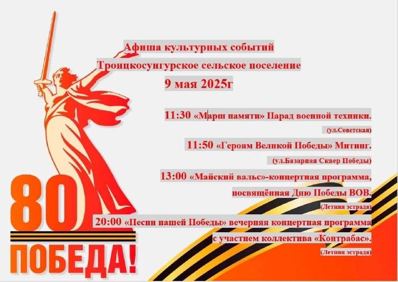 πΠ’ΡΠΎΠΈΡΠΊΠΎΡΡΠ½Π³ΡΡΡΠΊΠΎΠ΅ ΠΏΠΎΡΠ΅Π»Π΅Π½ΠΈΠ΅ ΠΏΡΠΈΠ³Π»Π°ΡΠ°Π΅Ρ ΠΆΠΈΡΠ΅Π»Π΅ΠΉ ΠΈ Π³ΠΎΡΡΠ΅ΠΉ ΠΏΡΠΈΠ½ΡΡΡ ΡΡΠ°ΡΡΠΈΠ΅ Π² ΠΏΡΠ°Π·Π΄Π½ΠΎΠ²Π°Π½ΠΈΠΈ 80-ΠΎΠΉ Π³ΠΎΠ΄ΠΎΠ²ΡΠΈΠ½Ρ ΡΠΎ ΠΠ½Ρ ΠΠΎΠ±Π΅Π΄Ρ Π² ΠΠ΅Π»ΠΈΠΊΠΎΠΉ ΠΡΠ΅ΡΠ΅ΡΡΠ²Π΅Π½Π½ΠΎΠΉ Π²ΠΎΠΉΠ½Π΅. π·πΊ π΄ΠΠ° ΠΏΠ»ΠΎΡΠ°Π΄ΠΈ ΠΏΠ΅ΡΠ΅Π΄ Π°Π΄ΠΌΠΈΠ½ΠΈΡΡΡΠ°ΡΠΈΠ΅ΠΉ Π±ΡΠ΄ΡΡ ΡΠ°Π±ΠΎΡΠ°ΡΡ Π°ΡΡΡΠ°ΠΊΡΠΈΠΎΠ½Ρ Π΄Π»Ρ Π΄Π΅ΡΠ΅ΠΉ, ΠΎΡΠ³Π°Π½ΠΈΠ·ΠΎΠ²Π°Π½ΠΎ ΠΊΠ°ΡΠ°Π½ΠΈΠ΅ Π½Π° Π»ΠΎΡΠ°Π΄ΡΡ