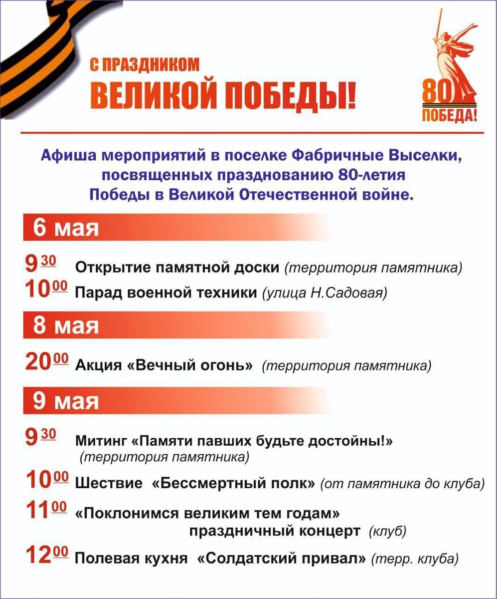 📍Полная готовность к празднованию Дня Великой Победы и в Фабричновыселковском сельском поселении 🕊️ 🔴В этот день мы будем вспоминать имена наших земляков - тех, кто защищал нашу Родину в тяжелые времена, спас мир от фашизма и тех кто работал в тылу. 🔴9 мая наша страна отмечает 80-ю годовщину Победы нашего народа над фашисткой Германией, священный день для людей всех поколений. Это праздник, который соединил в себе радость и скорбь, гордость за нашу историю и искреннюю печаль о многочисленных жертвах войны.🪖 Приглашаем жителей и гостей поселения принять участие в праздничных мероприятиях. 🇷🇺