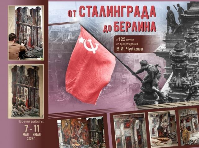 Волгоградский музей-заповедник «Сталинградская битва» открывает выставку «От Сталинграда до Берлина». Она приурочена к 125-летию со дня рождения Маршала Советского Союза, дважды Героя Советского Союза, командующего знаменитой 62-й Армией Василия Ивановича Чуйкова. Выставка расскажет о боевом пути прославленного военачальника. Основа её — героические события Сталинградской битвы, выдающаяся роль командарма-62 в разгроме врага на руинах города-героя. Отдельные разделы повествуют о послевоенном периоде жизни и службы маршала. Будут представлены документы, фотографии, личные вещи В. И. Чуйкова, его книги, а также образцы вооружения периода Великой Отечественной войны. Выставка откроется 12 мая и продлится до 11 июля 2025 года. Знак информационной продукции производителем не присвоен.