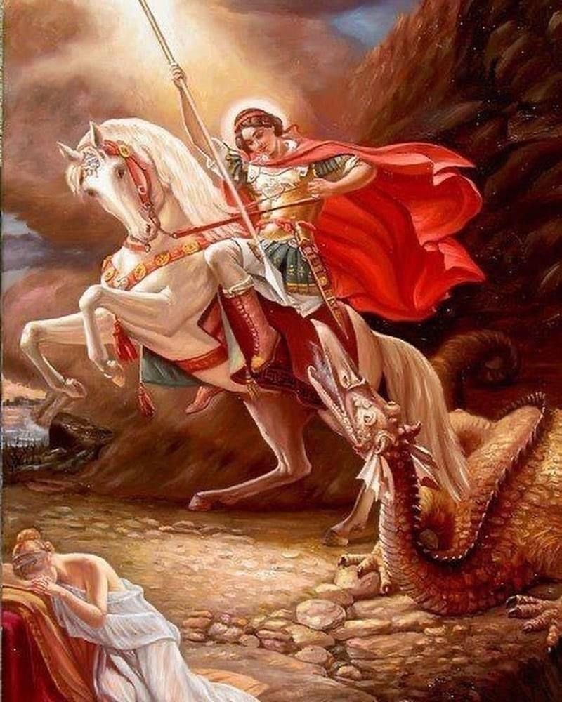 Упал снаряд, и совершилось чудо: На опаленной порохом стене Возник в дыму неведомо откуда Святой Георгий на лихом коне. От сотрясенья обнажилась фреска, Упала штукатурка поздних лет, — И он возник — торжественно и дерзко, Как древний знак сражений и побед. В сиянии возвышенного лика Простер десницу грозную свою, И острая карающая пика Пронзила ядовитую змею. А пулемет стучал в старинном храме, И ладил ленту молодой солдат, И трепетало яростное пламя, И отступал безбожный супостат. Анатолий Жигулин