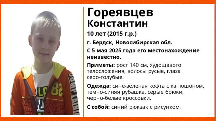 В городе Бердск под Новосибирском без вести пропал десятилетний Константин Гореявцев. Как сообщили в поисково-спасательном отряде (ПСО) «ЛизаАлерт», с 5 мая 2025 года его местонахождение неизвестно, поэтому к поискам подключились волонтеры. Приметы пропавшего: рост 140 сантиметров, худощавого телосложения, волосы русые, глаза серо-голубые. В день исчезновения мальчик был одет в сине-зеленую кофту с капюшоном, темно-синюю рубашку, серые брюки, черно-белые кроссовки. Также у него с собой был синий рюкзак с рисунком. Если у вас есть информация о местонахождении Константина Гореявцева, сообщите об этом по телефону ПСО 8-800-700-54-52 или наберите 112. Ранее «Вести Новосибирск» писали, что в Новосибирске нашли живой 14-летнюю школьницу с пирсингом в носу.