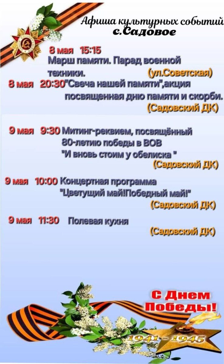 📍Праздник Победы в Садовом Садовое встречает юбилей Победы!🧧 8 и 9 Мая приглашаем всех на праздничные мероприятия: митинг, концерт, полевая кухня и «Свеча памяти». Чтим историю — празднуем вместе! 🇷🇺