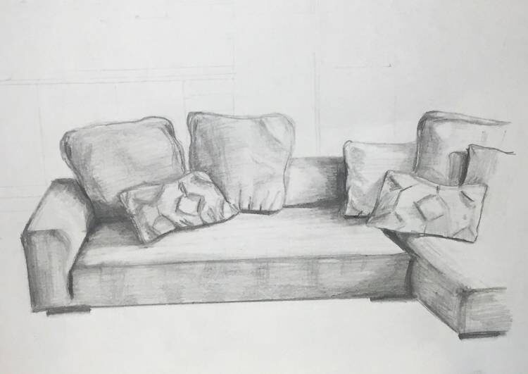 Диван часто стоит у стены, потому не отвлекает лишними перспективными искажениям. Кроме того, знакомый предмет снижает страх чистого листа, а значит, рука становится увереннее уже после первых набросков.