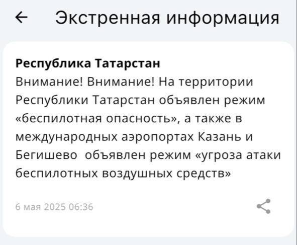 ❗️◽️◽️◽️На территории Татарстана объявлена «беспилотная опасность» - МЧС Также временно ограничена работа аэропортов Казани и Нижнекамска. При обнаружении БПЛА просьба позвонить по номеру 112. @tatmediaofficial