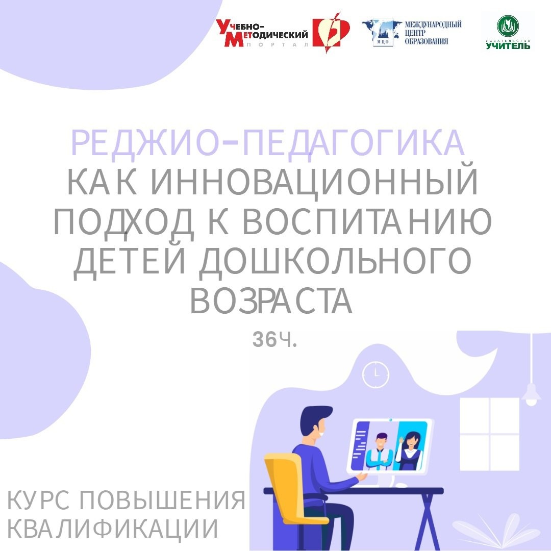Курс повышения квалификации "Реджио-педагогика как инновационный подход к воспитанию детей дошкольного возраста" https://www.uchmet.ru/events/item/3846315/ Формат: дистанционно, круглосуточный доступ к записям занятий и материалам (офлайн) Форма обучения: заочная Содержание настоящей программы повышения квалификации предусматривает рассмотрение следующих вопросов: - Предметно-пространственная среда в реджио-педагогике. - Методы и приемы реджио-педагогики. - Личность педагога в реджио-педагогике. - Проектная деятельность в реджио-педагогике. Выдаваемый документ: удостоверение установленного образца. Форма итоговой аттестации: тест. #повышениеКвалификацииПедагогу #учмет