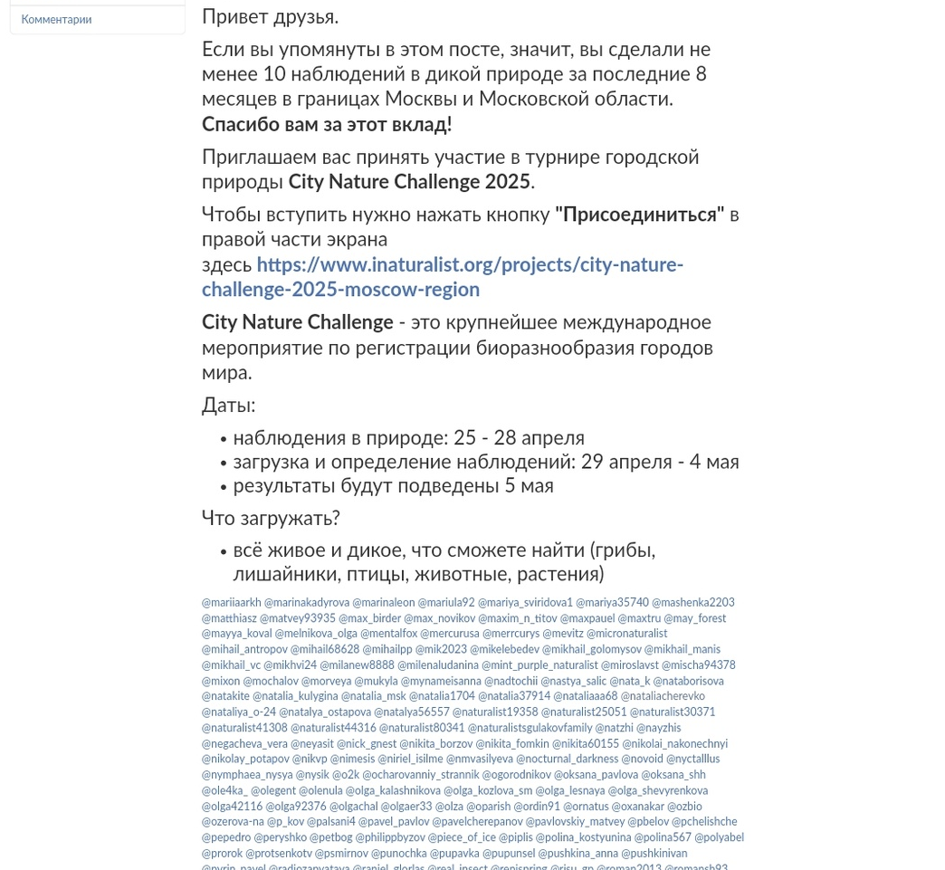 Зашел на свою страничку iNaturalist, вижу сообщение-приглашение от кураторов, присоединиться к проекту City Nature Challenge 2025 Moscow Region,