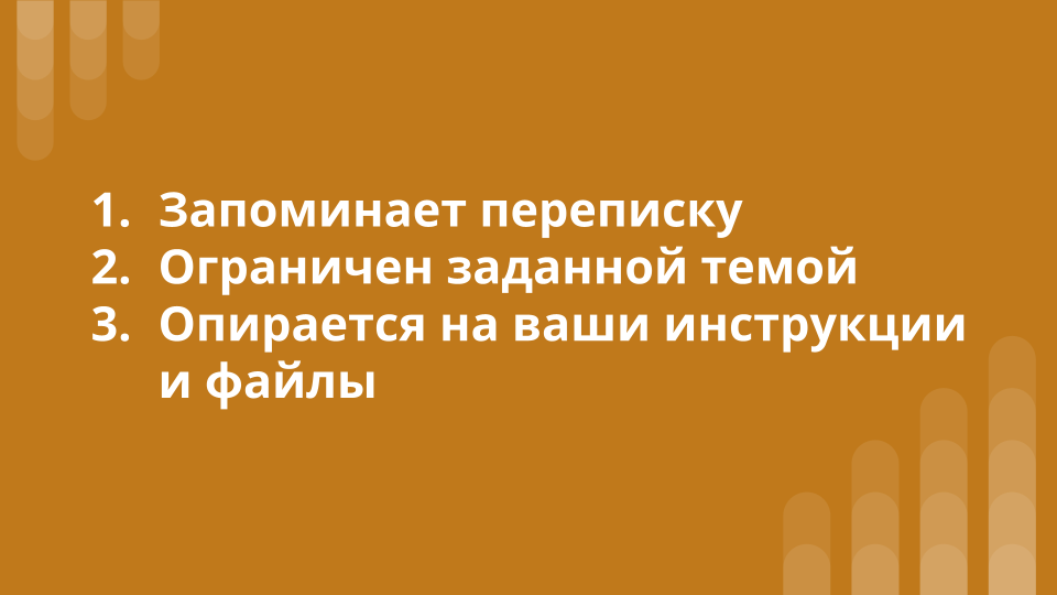 Он может быть кем угодно - менеджером по продажам, креативщиком, консультантом. Зависит от того, что вы в него заложите. Сделать такого бота совсем не сложно - вам не потребуется даже программирование. В видео показываем наглядно самый простой способ создать чат-бот на основе искусственного интеллекта Вконтакте. А если вы хотите сделать такого чат-бота в телеграмме, переходите на бесплатный мастер-класс: Чат-бот с ИИ в телеграм Если вы пока еще не делали чат-ботов в телеграм, рекомендуем начать с самого простого: