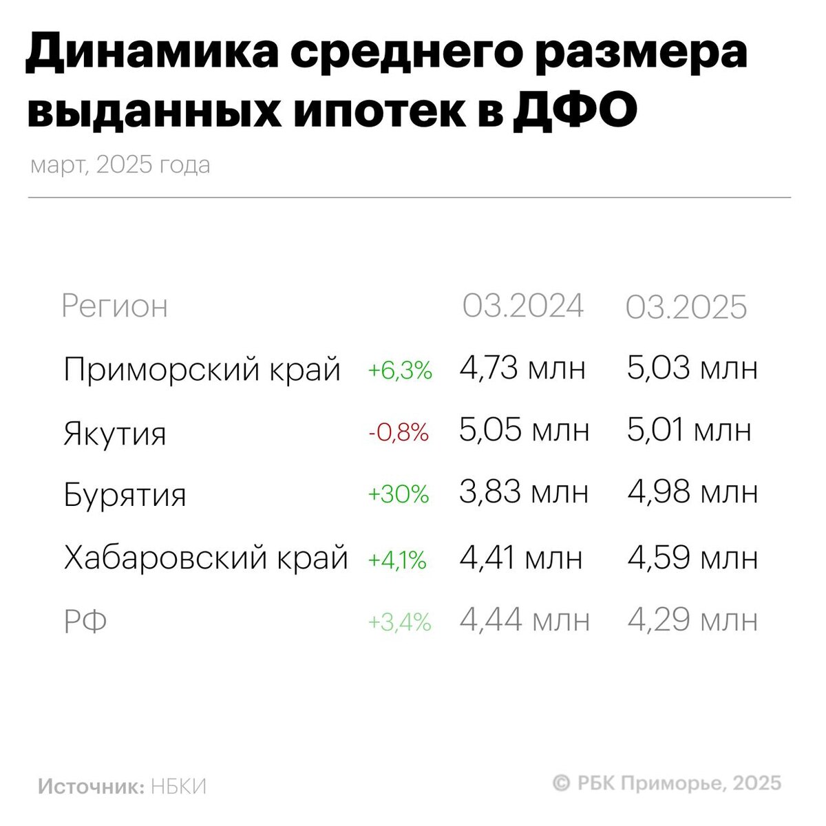 🥳 В Бурятии сильнее всего в стране вырос средний чек ипотеки – на 30% за год (до 4,98 млн руб.), сообщает НБКИ Однако лидерами среди дальневосточных регионов по среднему размеру жилищного кредита оказались Приморье и Якутия. Здесь по итогам марта 2025 года сумма «ипотечного чека» составила 5,03 и 5,01 млн руб. Этот показатель выше только в Москве, Московской области и Санкт-Петербурге. 🍱Подписывайтесь на РБК Восток